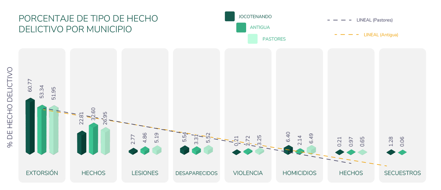 La Figura 3 permite evidenciar que Jocotenango y Antigua se enfrentan a una situación compleja de violencia estructural, donde la extorsión domina el panorama delictivo y amenaza particularmente a sectores juveniles.